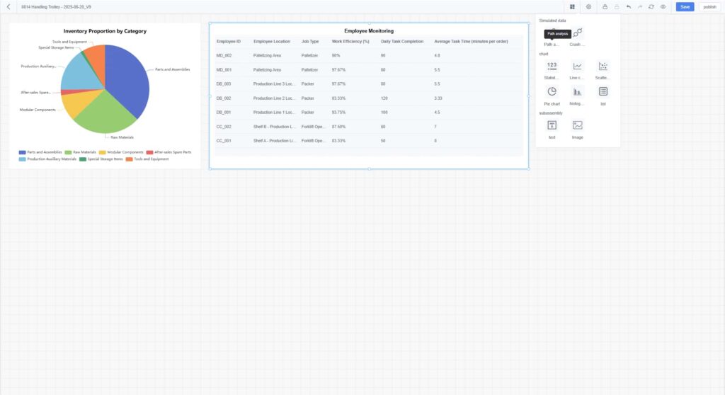 Even better, this feature works seamlessly with other elements in a scene. For example, in warehouse and logistics scenarios, you can simulate conveyors, goods, shelves, AGVs, and AMRs working together—monitoring collision risks in real time while tracking critical KPIs such as Overall Equipment Effectiveness (OEE).