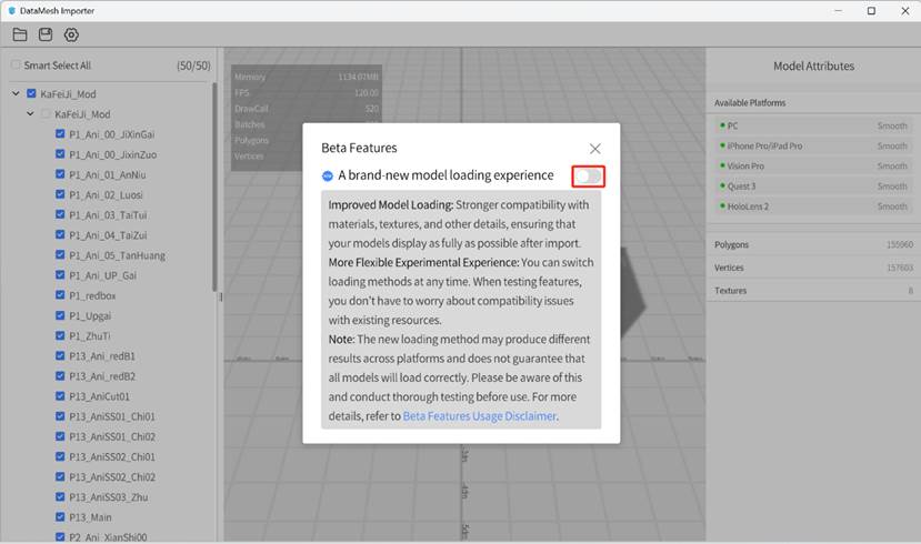 DataMesh Importer | Requires manual activation by the user | Activation Path: Settings > Beta Features > New Model Loading Experience |